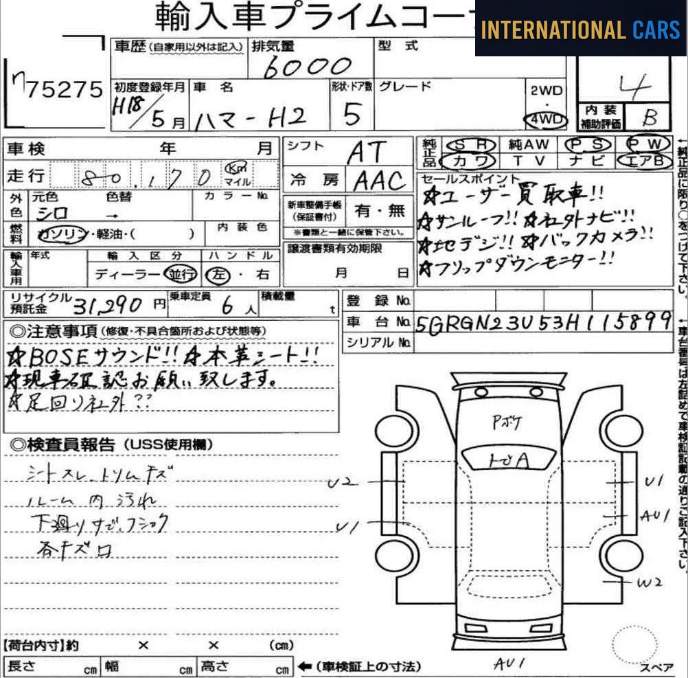 Voici une HUMMER H2 5D 4WD de 2006 mise en vente sur les grandes salles d'enchères du Japon. L'achat passe par notre enchérisseur licencié, au prix d'adjudication réel. Configuration : Année 2006 · 81 000 km · Essence · AT. Le compteur reflète une utilisation standard — pas de signal d'alerte particulier à ce stade.