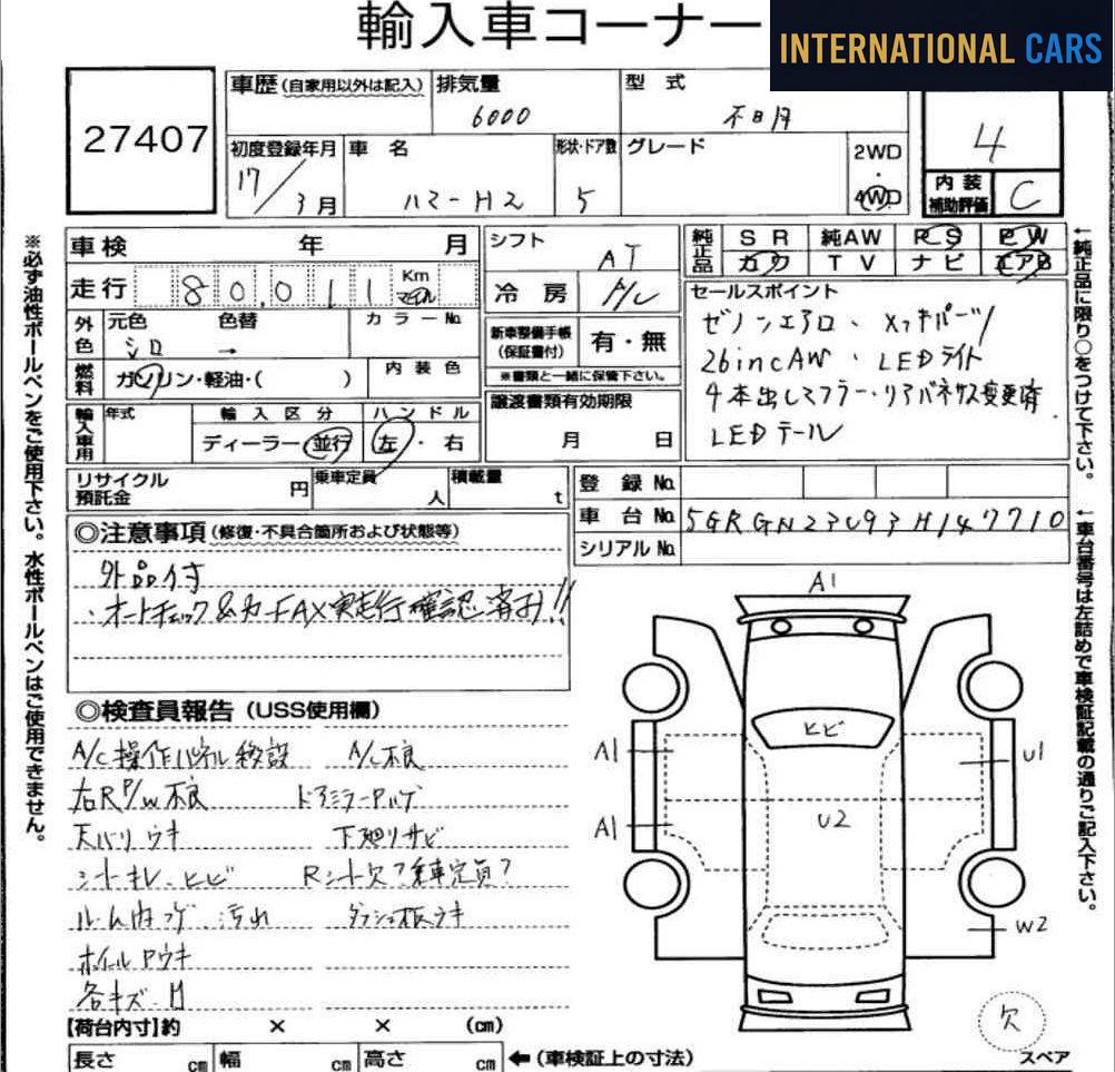 Cette HUMMER H2 5D 4WD de 2005 est proposée à l'importation directe depuis les salles d'enchères japonaises. Un véhicule sélectionné pour son historique transparent et son état contrôlé. Ce véhicule affiche 81 000 km pour une première mise en circulation en 2005 — motorisation essence et boîte at. Le compteur reflète une utilisation standard — pas de signal d'alerte particulier à ce stade.