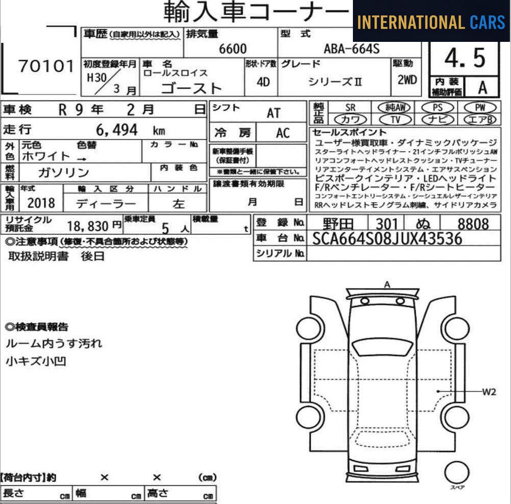 Cette ROLLS-ROYCE GHOST OTHERS de 2018 est proposée à l'importation directe depuis les salles d'enchères japonaises. Un véhicule sélectionné pour son historique transparent et son état contrôlé. Ce véhicule affiche 7 000 km pour une première mise en circulation en 2018 — motorisation essence et boîte at. Un kilométrage exceptionnellement bas pour ce modèle, signe d'une utilisation préservée.