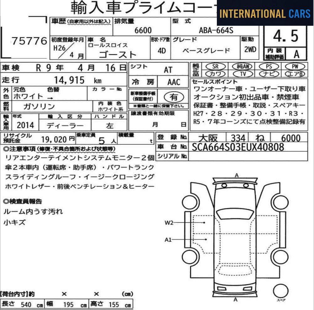 Voici une ROLLS-ROYCE GHOST BASE GRADE de 2014 mise en vente sur les grandes salles d'enchères du Japon. L'achat passe par notre enchérisseur licencié, au prix d'adjudication réel. Caractéristiques principales : mise en circulation en 2014, 15 000 km au compteur, motorisation essence, boîte at. Avec si peu de kilomètres au compteur, la mécanique a bénéficié d'un rodage minimal et reste quasi neuve.