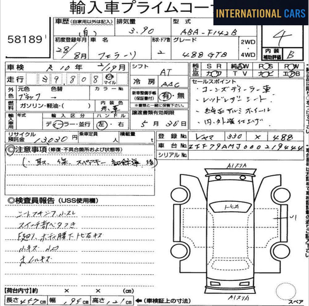 Voici une FERRARI 488 GTB de 2016 mise en vente sur les grandes salles d'enchères du Japon. L'achat passe par notre enchérisseur licencié, au prix d'adjudication réel. Ce véhicule affiche 40 000 km pour une première mise en circulation en 2016 — motorisation essence et boîte at. Un parcours raisonnable pour un véhicule de cette année — mécanique et organes d'usure dans les meilleures conditions.