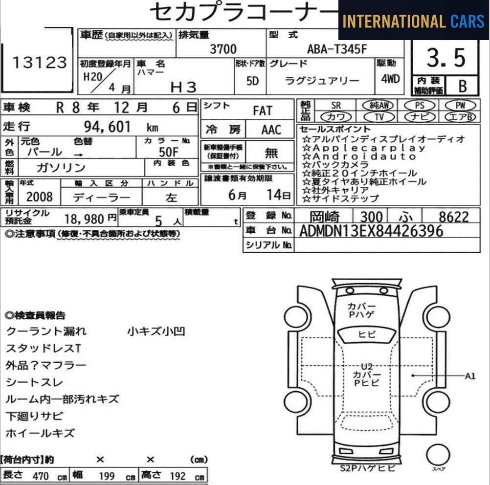 Voici une HUMMER H3 4WD LUXURY de 2008 mise en vente sur les grandes salles d'enchères du Japon. L'achat passe par notre enchérisseur licencié, au prix d'adjudication réel. Ce véhicule affiche 95 000 km pour une première mise en circulation en 2008 — motorisation essence et boîte fa. Kilométrage dans la moyenne pour l'ancienneté du véhicule.