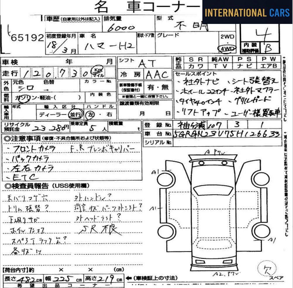 Ce HUMMER H2 5D 4WD année 2006 provient des enchères japonaises — un marché réputé pour la rigueur de ses inspections et la transparence totale de ses rapports. Ce véhicule affiche 121 000 km pour une première mise en circulation en 2006 — motorisation essence et boîte at. Le compteur reflète une utilisation standard — pas de signal d'alerte particulier à ce stade.