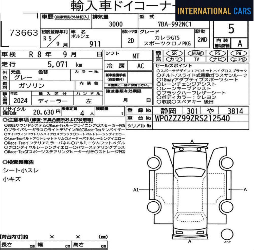 Ce PORSCHE 911 CP OTHERS année 2023 provient des enchères japonaises — un marché réputé pour la rigueur de ses inspections et la transparence totale de ses rapports. Caractéristiques principales : mise en circulation en 2023, 6 000 km au compteur, motorisation essence, boîte mt. Ce faible kilométrage positionne le véhicule parmi les exemplaires les mieux conservés de sa catégorie.