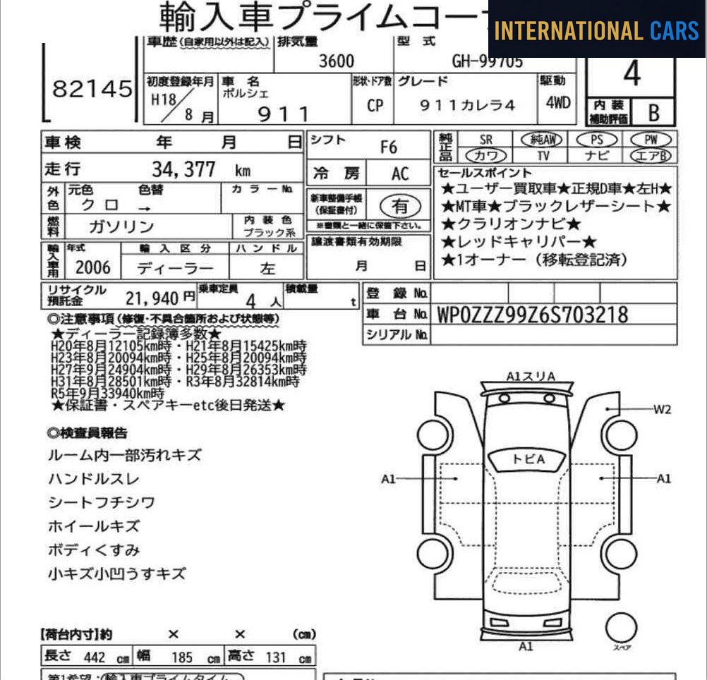 PORSCHE 911 CP 4WD 911 CARRERA 4 2006 — un véhicule repéré sur les enchères japonaises, marché où chaque voiture est notée, décrite et inspectée avant la vente. Configuration : Année 2006 · 35 000 km · Essence · F6. Ce kilométrage rassurant indique un véhicule peu sollicité sur la durée.