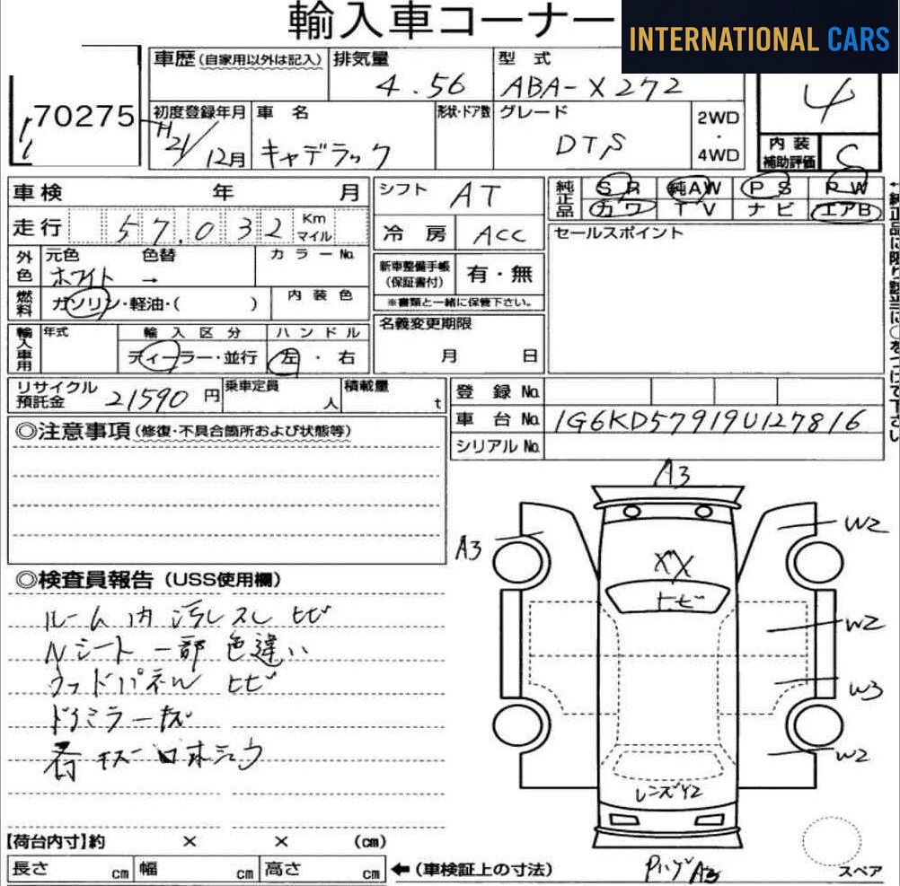 Voici une CADILLAC DTS de 2009 mise en vente sur les grandes salles d'enchères du Japon. L'achat passe par notre enchérisseur licencié, au prix d'adjudication réel. Configuration : Année 2009 · 58 000 km · Essence · AT. Le kilométrage modéré laisse encore une grande marge d'utilisation avant les premières révisions majeures.