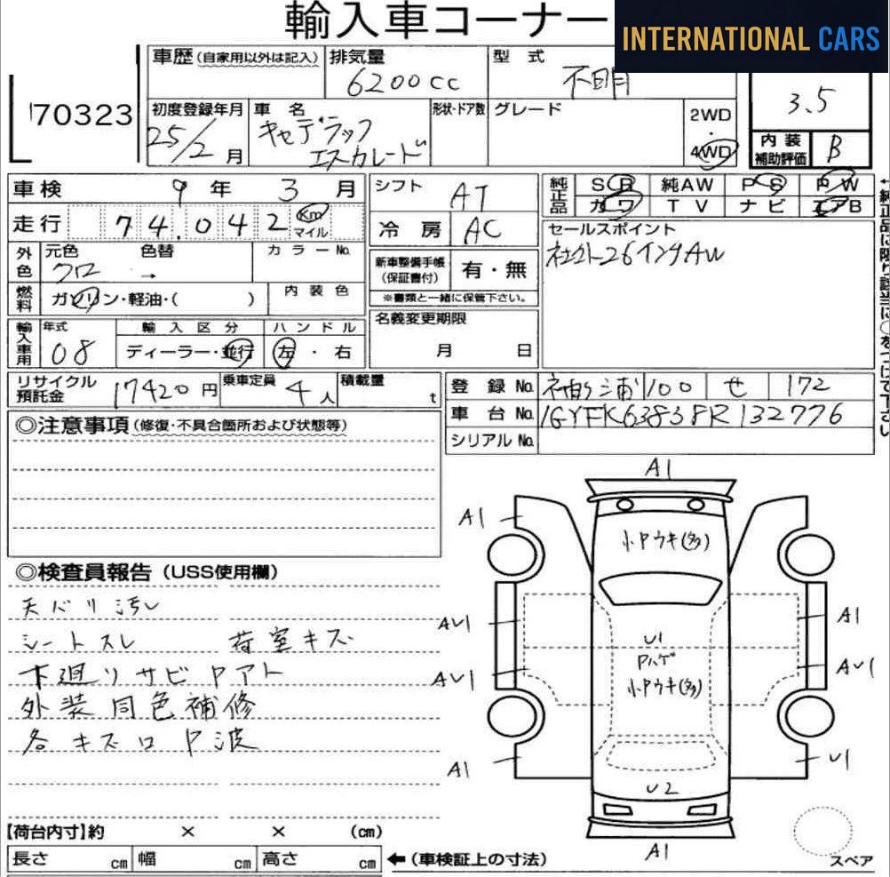 Découvrez cette CADILLAC ESCALADE 4WD (2013), disponible aux enchères japonaises. International Cars l'enchérit pour vous au prix réel du marché, sans marge cachée. Caractéristiques principales : mise en circulation en 2013, 75 000 km au compteur, motorisation essence, boîte at. Ce kilométrage rassurant indique un véhicule peu sollicité sur la durée.