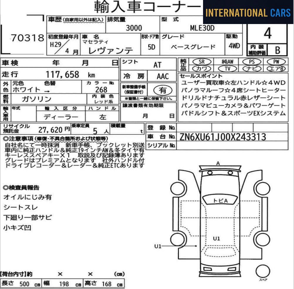 Le Japon est un terrain privilégié pour trouver des MASERATI LEVANTE 4WD BASE GRADE 2017 en excellent état, grâce à son système d'enchères structuré et à ses habitudes d'utilisation.