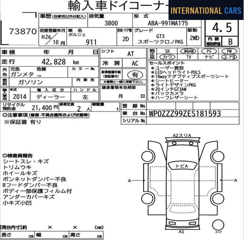 Le Japon est un terrain privilégié pour trouver des PORSCHE 911 CP OTHERS 2014 en excellent état, grâce à son système d'enchères structuré et à ses habitudes d'utilisation.