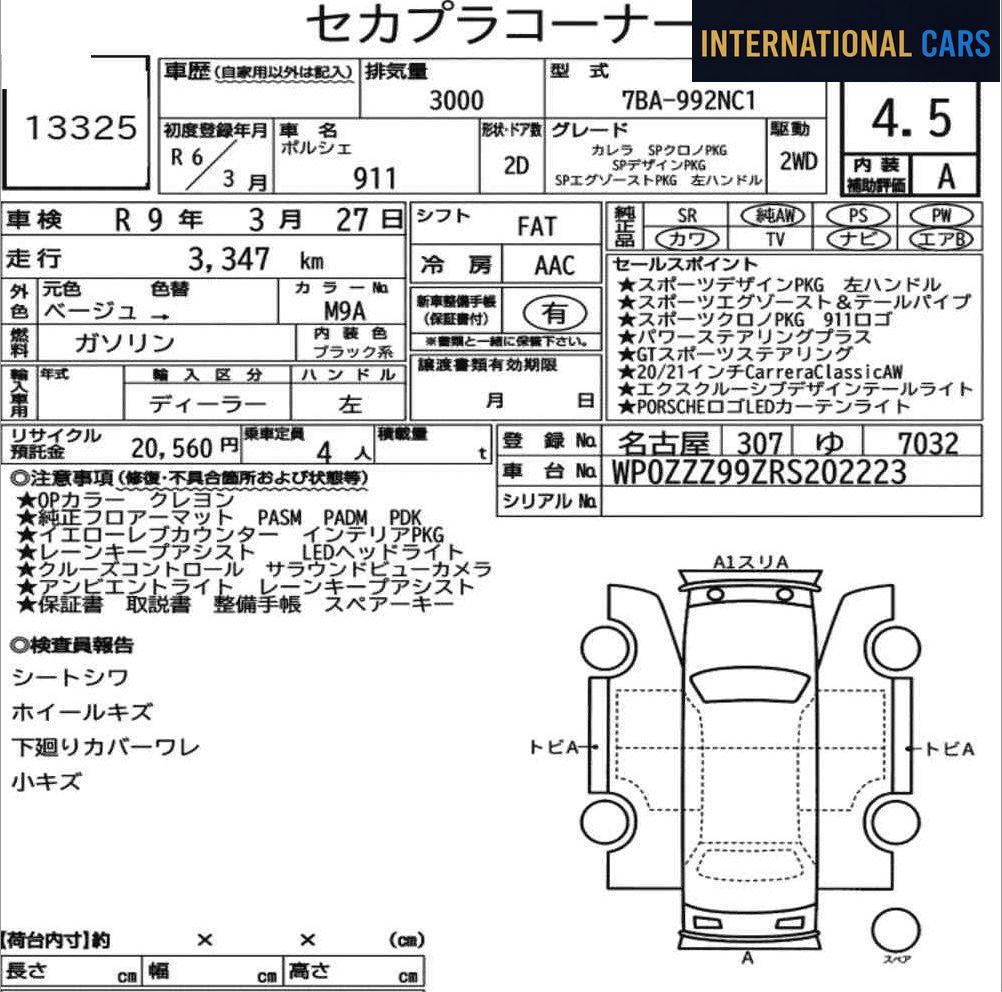 PORSCHE 911 CP OTHERS 2024 — un véhicule repéré sur les enchères japonaises, marché où chaque voiture est notée, décrite et inspectée avant la vente. Configuration : Année 2024 · 4 000 km · Essence · FA. Avec si peu de kilomètres au compteur, la mécanique a bénéficié d'un rodage minimal et reste quasi neuve.