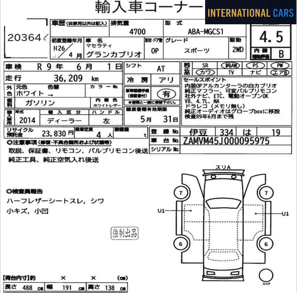 Ce MASERATI GRANCABRIO SPORTS année 2014 provient des enchères japonaises — un marché réputé pour la rigueur de ses inspections et la transparence totale de ses rapports. Configuration : Année 2014 · 37 000 km · Essence · AT. Ce kilométrage rassurant indique un véhicule peu sollicité sur la durée.