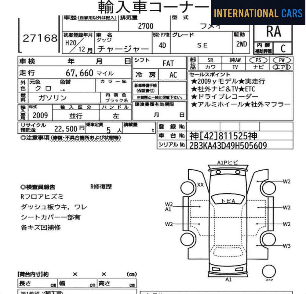 Ce DODGE CHARGER 4D SE année 2008 provient des enchères japonaises — un marché réputé pour la rigueur de ses inspections et la transparence totale de ses rapports. Configuration : Année 2008 · 68 000 km · Essence · FA. Un parcours raisonnable pour un véhicule de cette année — mécanique et organes d'usure dans les meilleures conditions.
