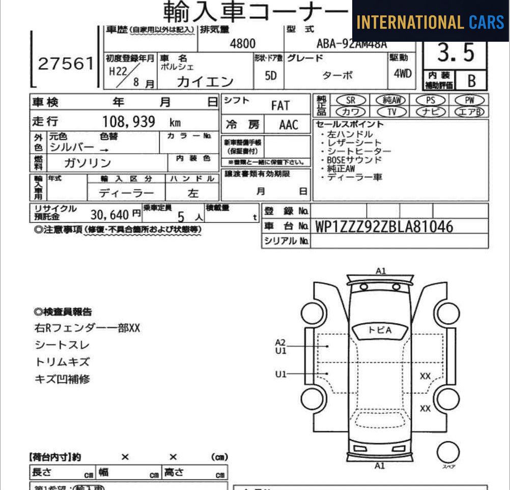 Cette PORSCHE CAYENNE 4WD TURBO de 2010 est proposée à l'importation directe depuis les salles d'enchères japonaises. Un véhicule sélectionné pour son historique transparent et son état contrôlé. Ce véhicule affiche 109 000 km pour une première mise en circulation en 2010 — motorisation essence et boîte fa. Kilométrage dans la moyenne pour l'ancienneté du véhicule.
