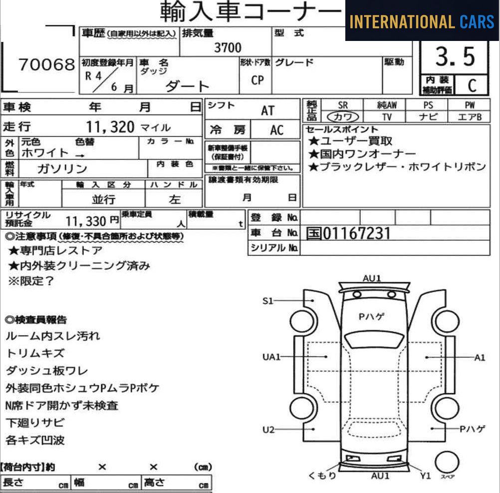 Ce DODGE DART année 2022 provient des enchères japonaises — un marché réputé pour la rigueur de ses inspections et la transparence totale de ses rapports. Caractéristiques principales : mise en circulation en 2022, 12 000 km au compteur, motorisation essence, boîte at. Avec si peu de kilomètres au compteur, la mécanique a bénéficié d'un rodage minimal et reste quasi neuve.