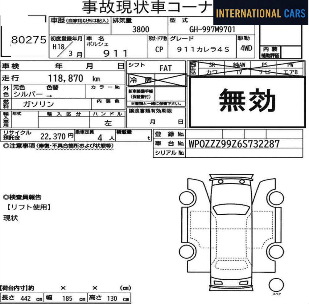 Cette PORSCHE 911 CP 4WD 911 CARRERA 4S de 2006 est proposée à l'importation directe depuis les salles d'enchères japonaises. Un véhicule sélectionné pour son historique transparent et son état contrôlé. Ce véhicule affiche 119 000 km pour une première mise en circulation en 2006 — motorisation essence et boîte fa. Un kilométrage cohérent avec l'année du véhicule, attestant d'une utilisation régulière mais raisonnable.