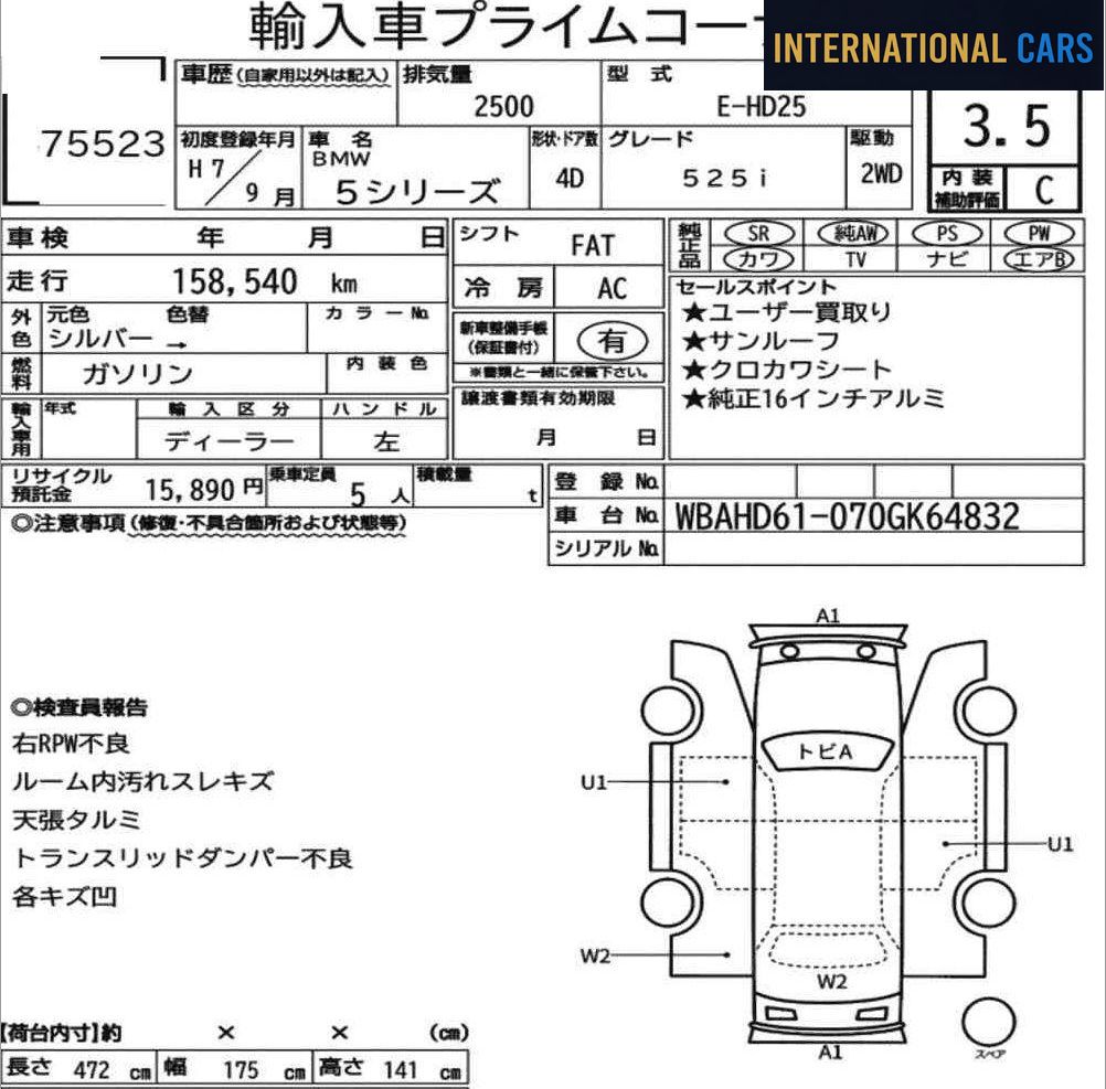 Voici une BMW 5 SERIES 4D 525I de 1995 mise en vente sur les grandes salles d'enchères du Japon. L'achat passe par notre enchérisseur licencié, au prix d'adjudication réel. Configuration : Année 1995 · 159 000 km · Essence · FA. Le kilométrage est élevé — il traduit souvent une mécanique déjà bien sollicitée, mais aussi un entretien suivi chez des propriétaires attentifs.