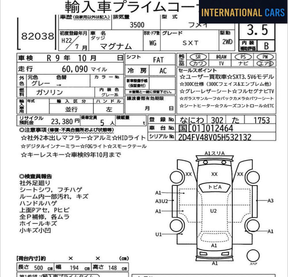 DODGE MAGNUM SXT 2010 — un véhicule repéré sur les enchères japonaises, marché où chaque voiture est notée, décrite et inspectée avant la vente. Ce véhicule affiche 61 000 km pour une première mise en circulation en 2010 — motorisation essence et boîte fa. Le kilométrage modéré laisse encore une grande marge d'utilisation avant les premières révisions majeures.