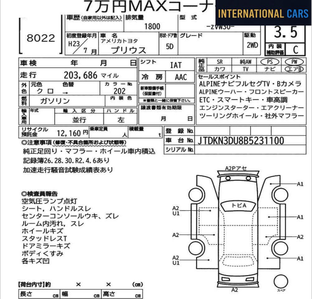 Voici une AMERICA TOYOTA PRIUS 5D de 2011 mise en vente sur les grandes salles d'enchères du Japon. L'achat passe par notre enchérisseur licencié, au prix d'adjudication réel. Ce véhicule affiche 204 000 km pour une première mise en circulation en 2011 — motorisation essence et boîte ia. Ce kilométrage important peut être compensé par un historique d'entretien rigoureux, à vérifier via les rapports d'inspection.