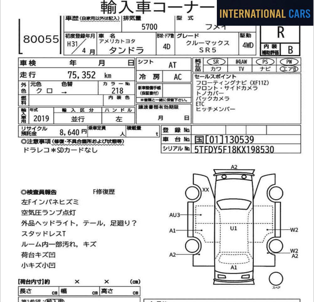 Voici une AMERICA TOYOTA TUNDRA 4D 4WD CREWMAX SR5 de 2019 mise en vente sur les grandes salles d'enchères du Japon. L'achat passe par notre enchérisseur licencié, au prix d'adjudication réel. Ce véhicule affiche 76 000 km pour une première mise en circulation en 2019 — motorisation essence et boîte at. Le kilométrage modéré laisse encore une grande marge d'utilisation avant les premières révisions majeures.