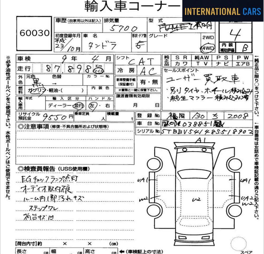 Voici une AMERICA TOYOTA TUNDRA 4D 4WD de 2011 mise en vente sur les grandes salles d'enchères du Japon. L'achat passe par notre enchérisseur licencié, au prix d'adjudication réel. Configuration : Année 2011 · 88 000 km · Essence · CA. Un kilométrage cohérent avec l'année du véhicule, attestant d'une utilisation régulière mais raisonnable.
