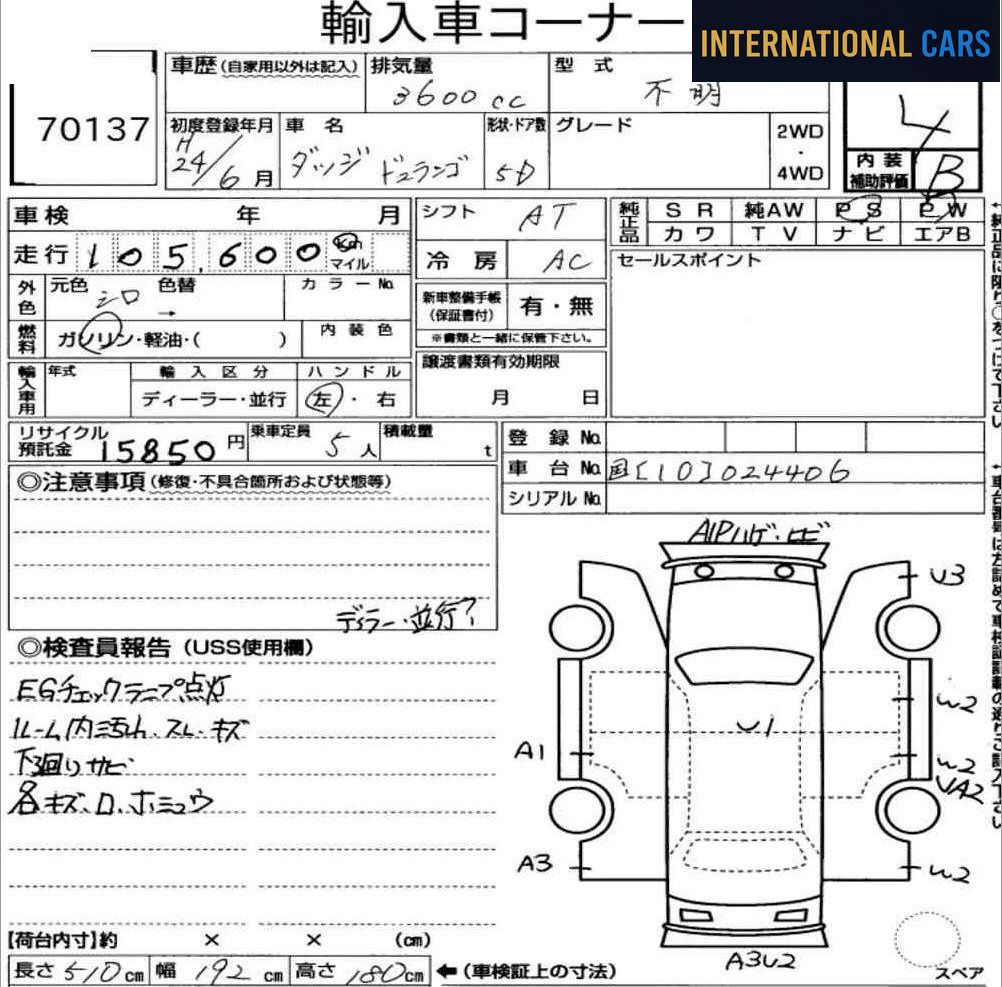 Voici une DODGE DURANGO de 2012 mise en vente sur les grandes salles d'enchères du Japon. L'achat passe par notre enchérisseur licencié, au prix d'adjudication réel. Caractéristiques principales : mise en circulation en 2012, 106 000 km au compteur, motorisation essence, boîte at. Kilométrage dans la moyenne pour l'ancienneté du véhicule.