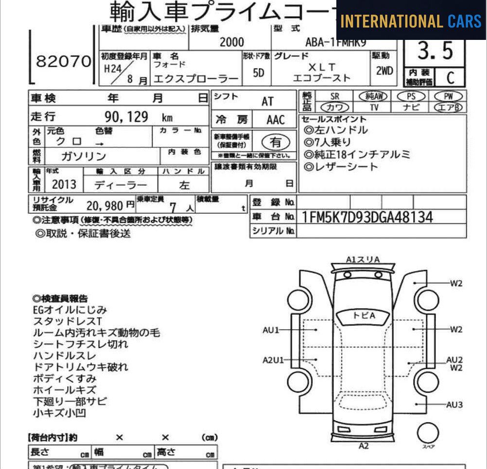 Cette FORD EXPLORER 5D XLT ECO BOOST de 2012 est proposée à l'importation directe depuis les salles d'enchères japonaises. Un véhicule sélectionné pour son historique transparent et son état contrôlé. Ce véhicule affiche 91 000 km pour une première mise en circulation en 2012 — motorisation essence et boîte at. Kilométrage dans la moyenne pour l'ancienneté du véhicule.