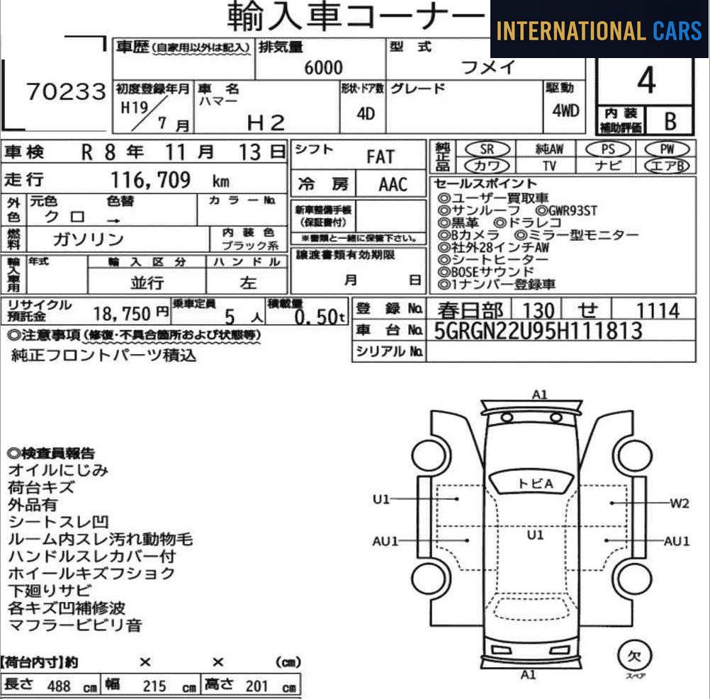 Ce HUMMER H2 4D 4WD année 2007 provient des enchères japonaises — un marché réputé pour la rigueur de ses inspections et la transparence totale de ses rapports. Caractéristiques principales : mise en circulation en 2007, 117 000 km au compteur, motorisation essence, boîte fa. Un kilométrage cohérent avec l'année du véhicule, attestant d'une utilisation régulière mais raisonnable.