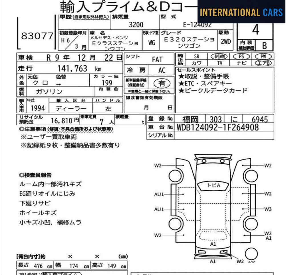 Pour toute demande sur ce MERCEDES BENZ E-CLASS STATIONWAGON E320 STATIONWAGON (1994), contactez notre équipe : nous vous communiquons le coût final livré en France, transport, douane et homologation inclus.