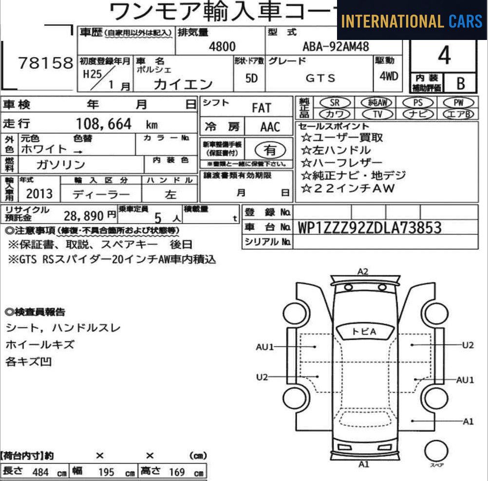 Ce PORSCHE CAYENNE 4WD GTS année 2013 provient des enchères japonaises — un marché réputé pour la rigueur de ses inspections et la transparence totale de ses rapports. Ce véhicule affiche 109 000 km pour une première mise en circulation en 2013 — motorisation essence et boîte fa. Kilométrage dans la moyenne pour l'ancienneté du véhicule.