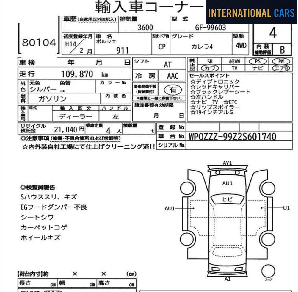 Le Japon est un terrain privilégié pour trouver des PORSCHE 911 CP 4WD 911 CARRERA 4 2002 en excellent état, grâce à son système d'enchères structuré et à ses habitudes d'utilisation.