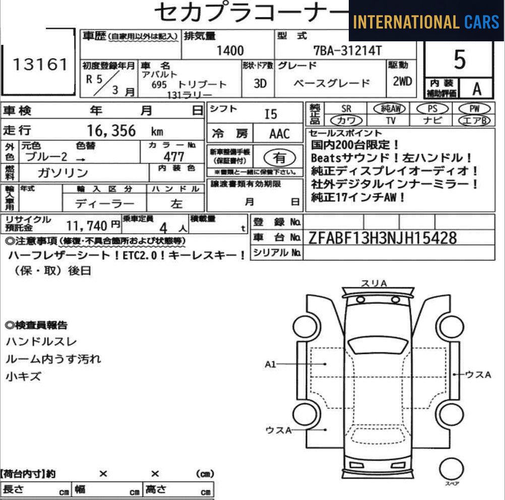 Voici une ABARTH 695 TRIBUTO 131 RALLY BASE GRADE de 2023 mise en vente sur les grandes salles d'enchères du Japon. L'achat passe par notre enchérisseur licencié, au prix d'adjudication réel. Ce véhicule affiche 17 000 km pour une première mise en circulation en 2023 — motorisation essence et boîte i5. Avec si peu de kilomètres au compteur, la mécanique a bénéficié d'un rodage minimal et reste quasi neuve.